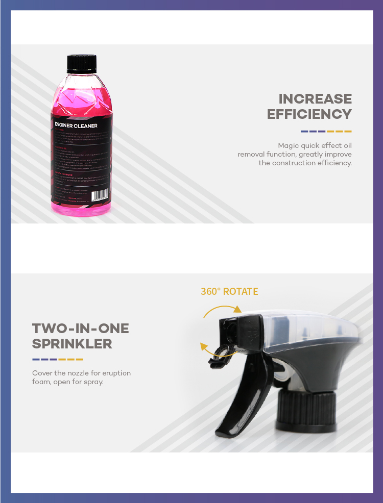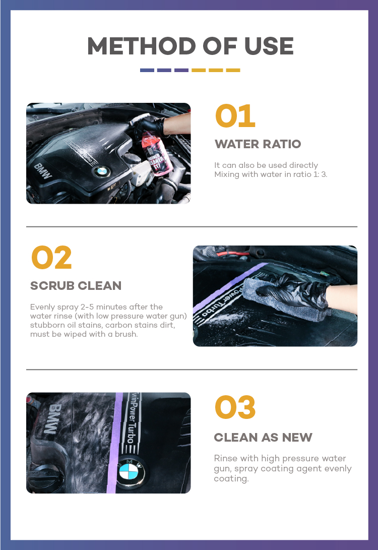 This product is PH neutral formula. It can quickly remove oil grease and dust from all kinds of Auto Engines like car engine bay and boat engines. It uses specific care cleaning factors for the engine bay components to delay aging and make the engine bay shine as new