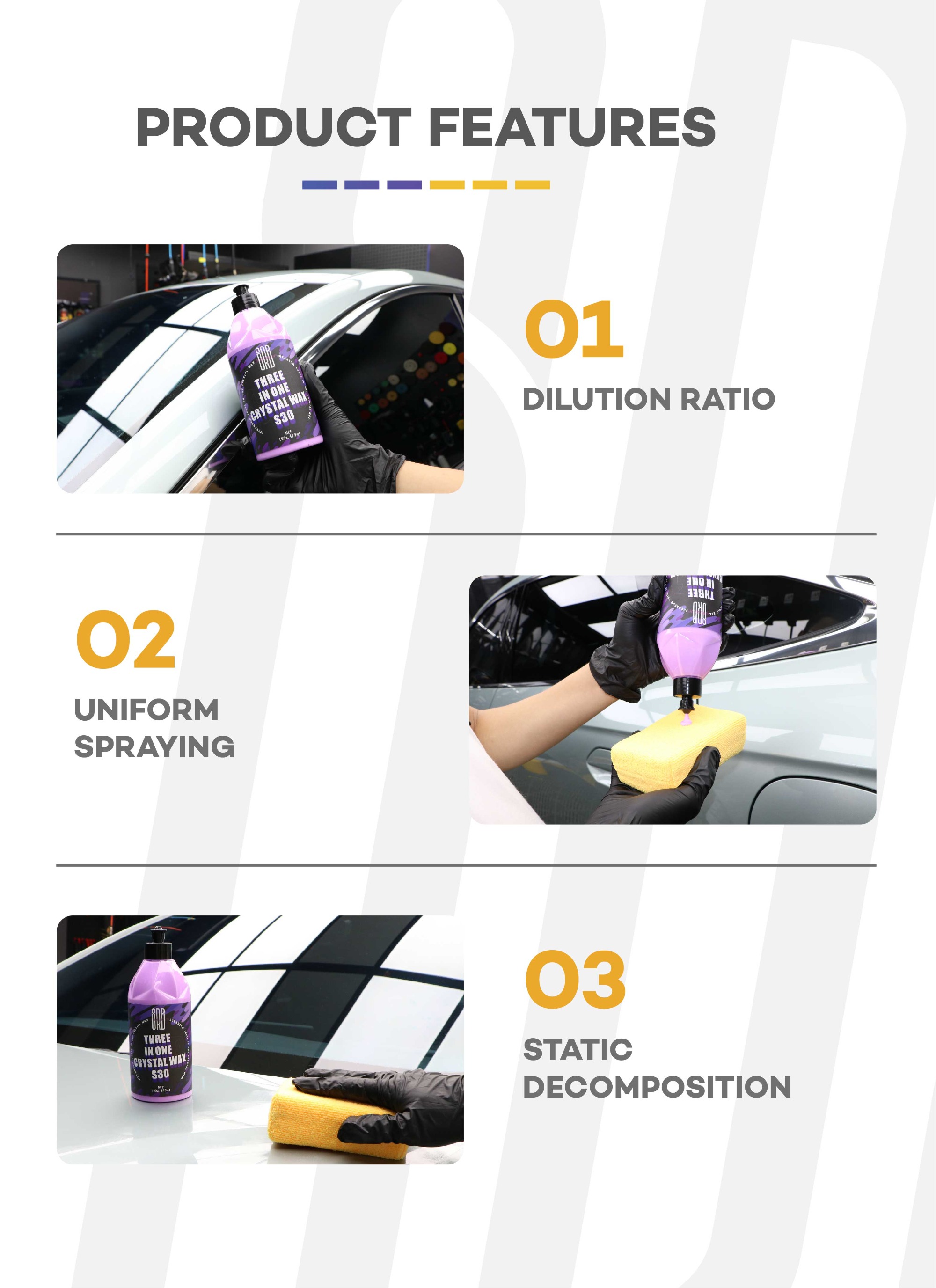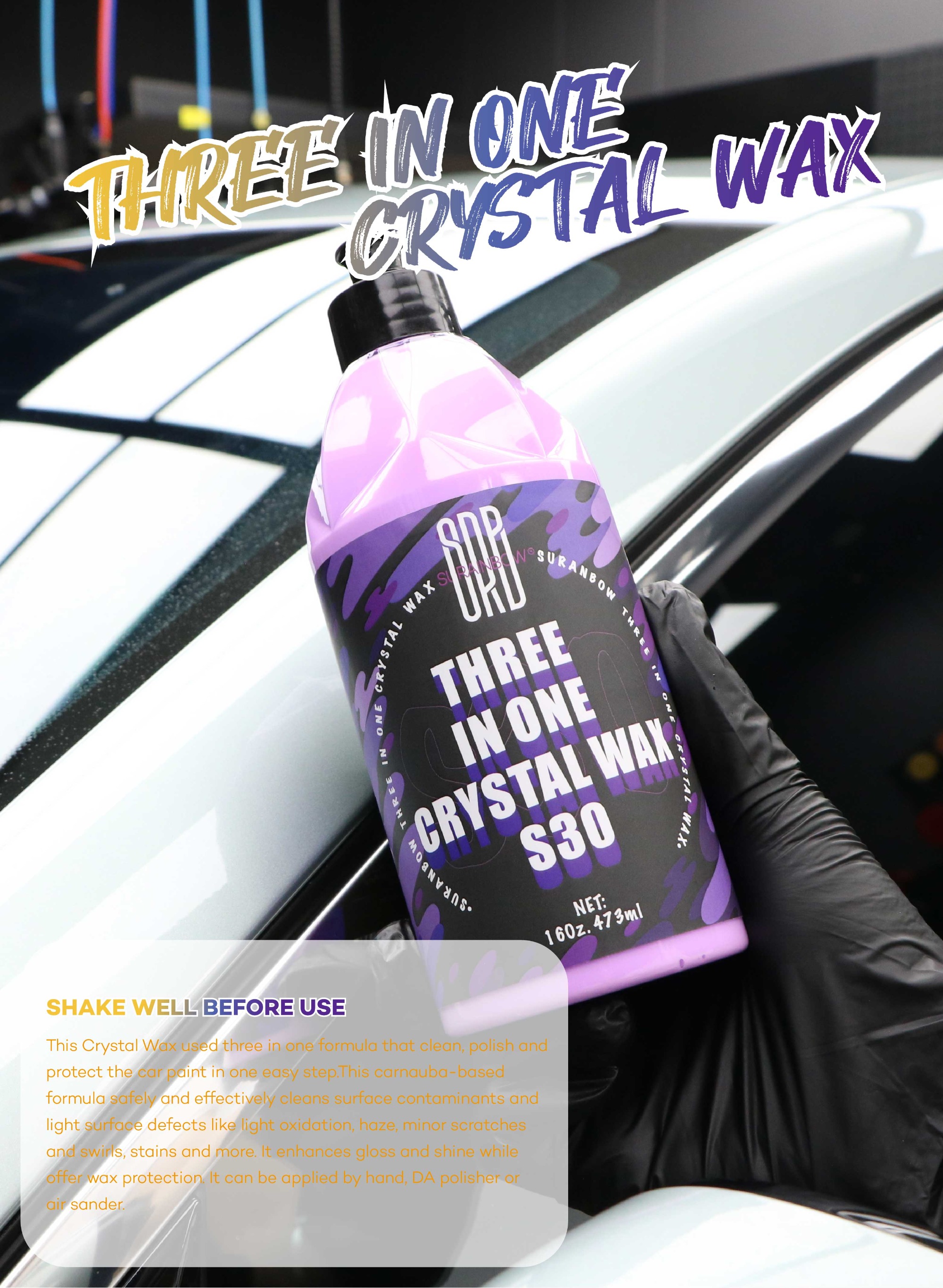 This crystal wax uses a 3-in-1 formula, Cleans,polishes, and protects your car paint in a simple step. This carnauba-based formula safely and effectively cleans Surface contaminants and minor surface defects, such as light oxidation, haze, minor scratches
