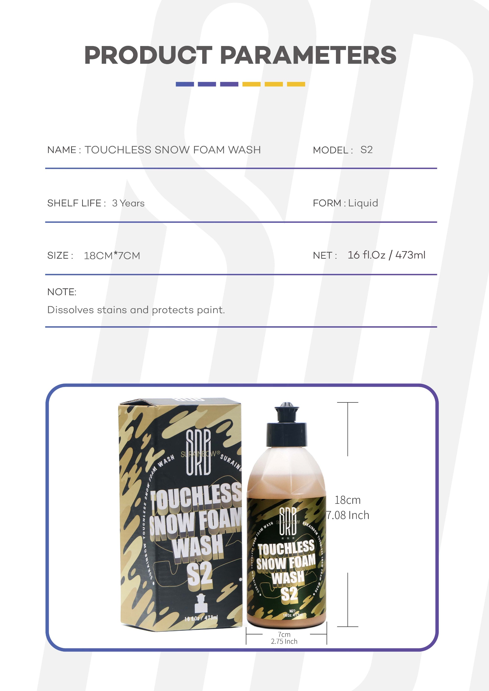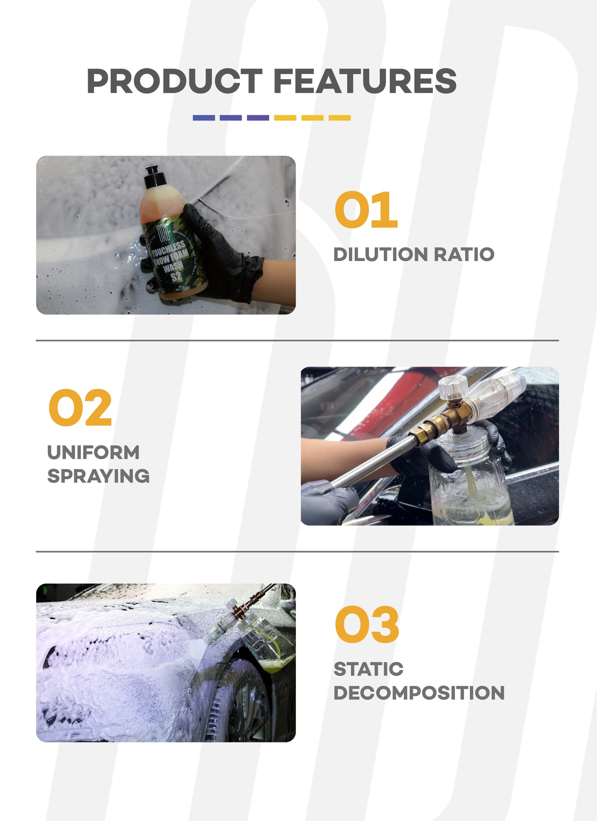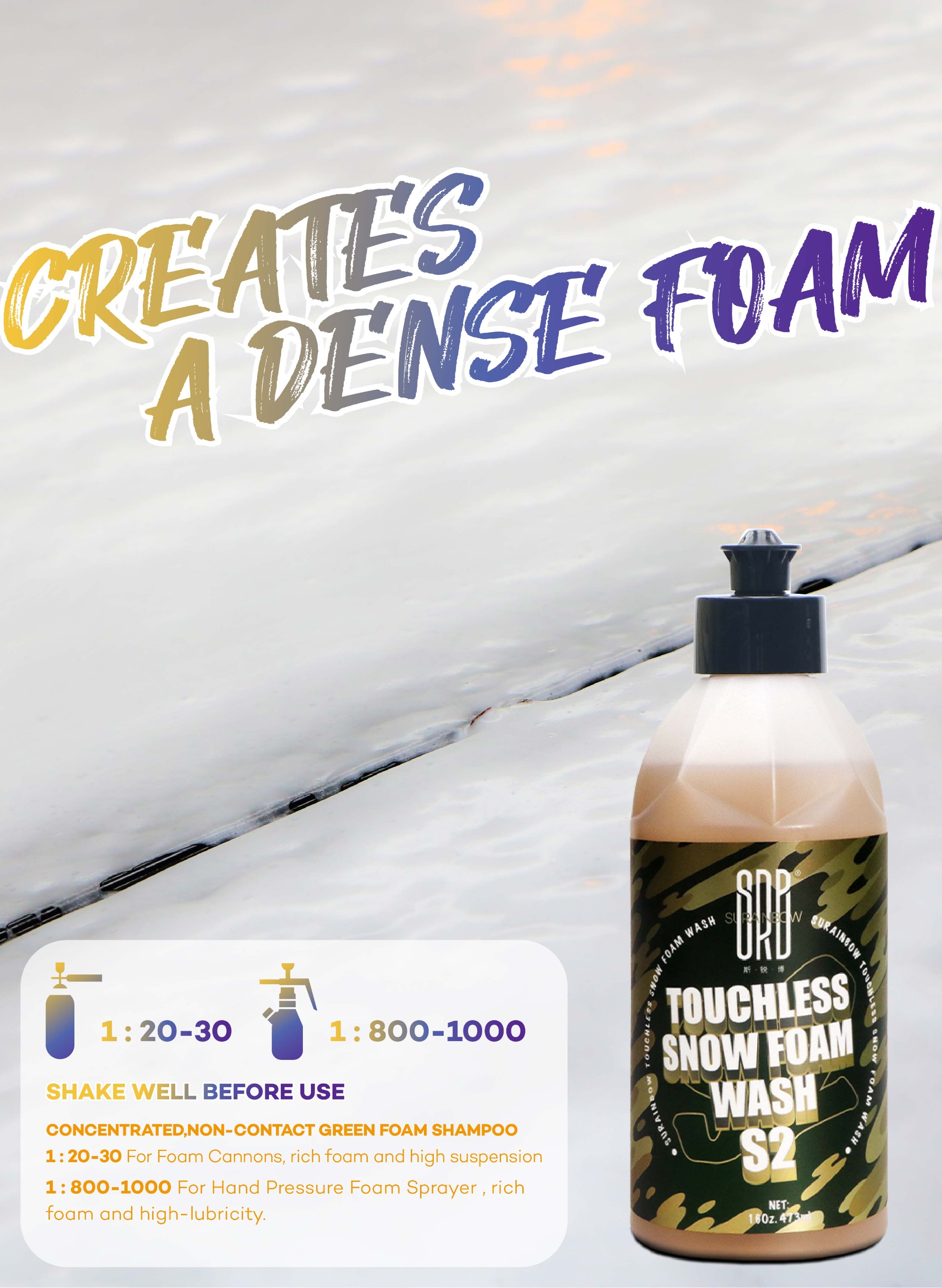 This product is concentrated touchless shampoo, suitable for cleaning small cars and trucks, generates stable rich foam to easily remove road dust, grime, oil stains and insect marks. It can produce stable foam and easy to clean the car paint.Non-destructive to aluminum and nickel-plated surfaces and other non-ferrous alloy coatings. This products contains preservative additives.The average dosage for a small car is 20-50 grams of concentrate.
